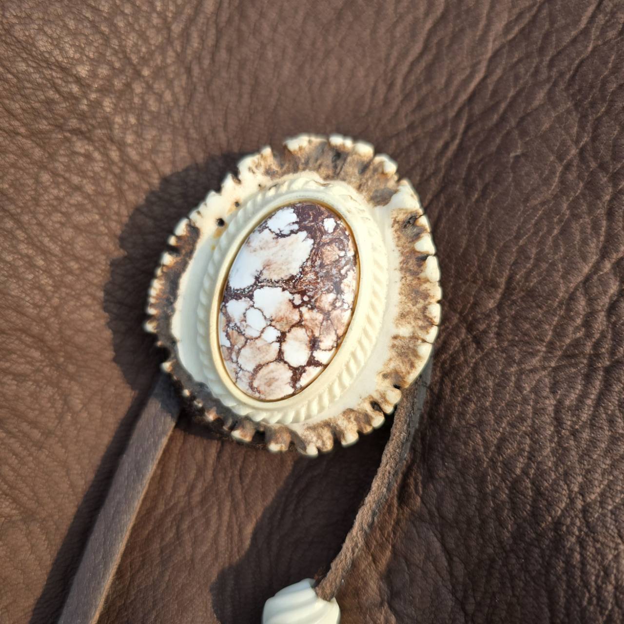 鹿角本来の自然な風合いを残した根元部分を土台に、ワイルドホースをセットしたコンチョを制作し、取り付けました。