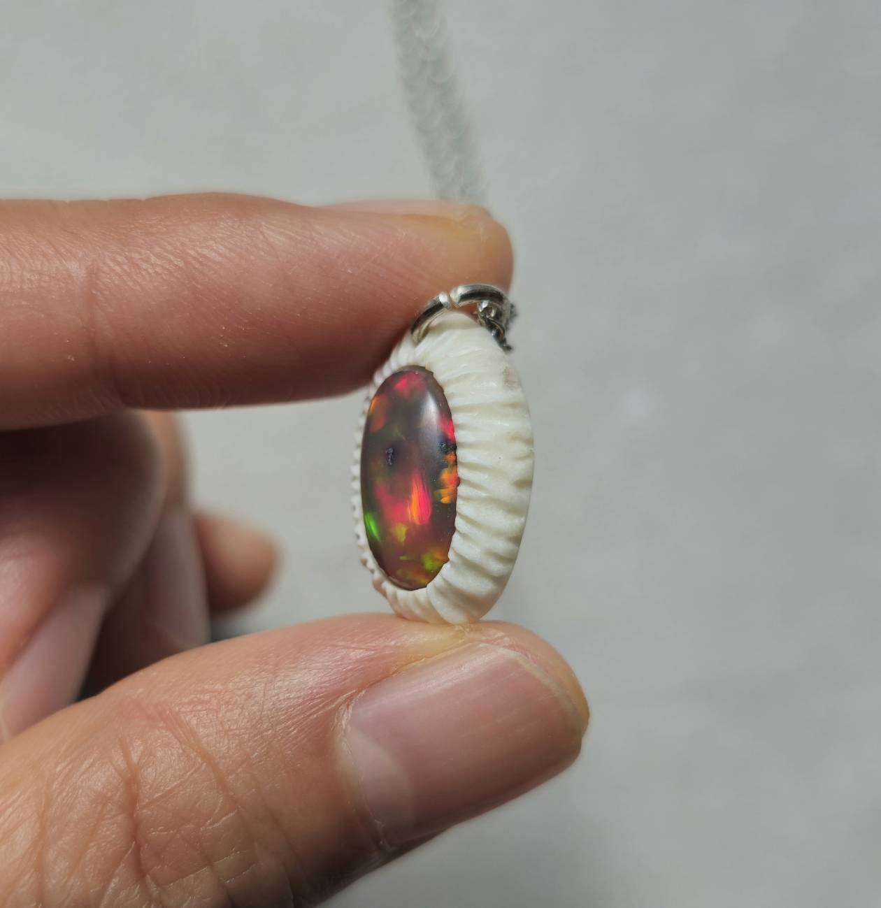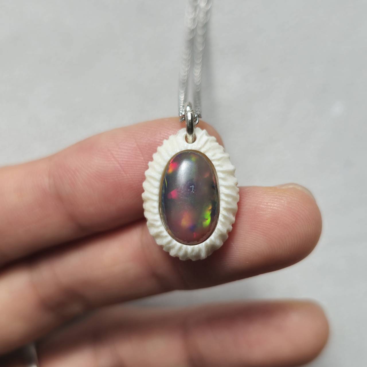 ナチュラルな角の質感や色合い、ブラックオパールの見る角度によって変化する多彩な輝き、模様の凹凸による立体感、自然素材と宝石の調和を感じていただけましたら幸いです。