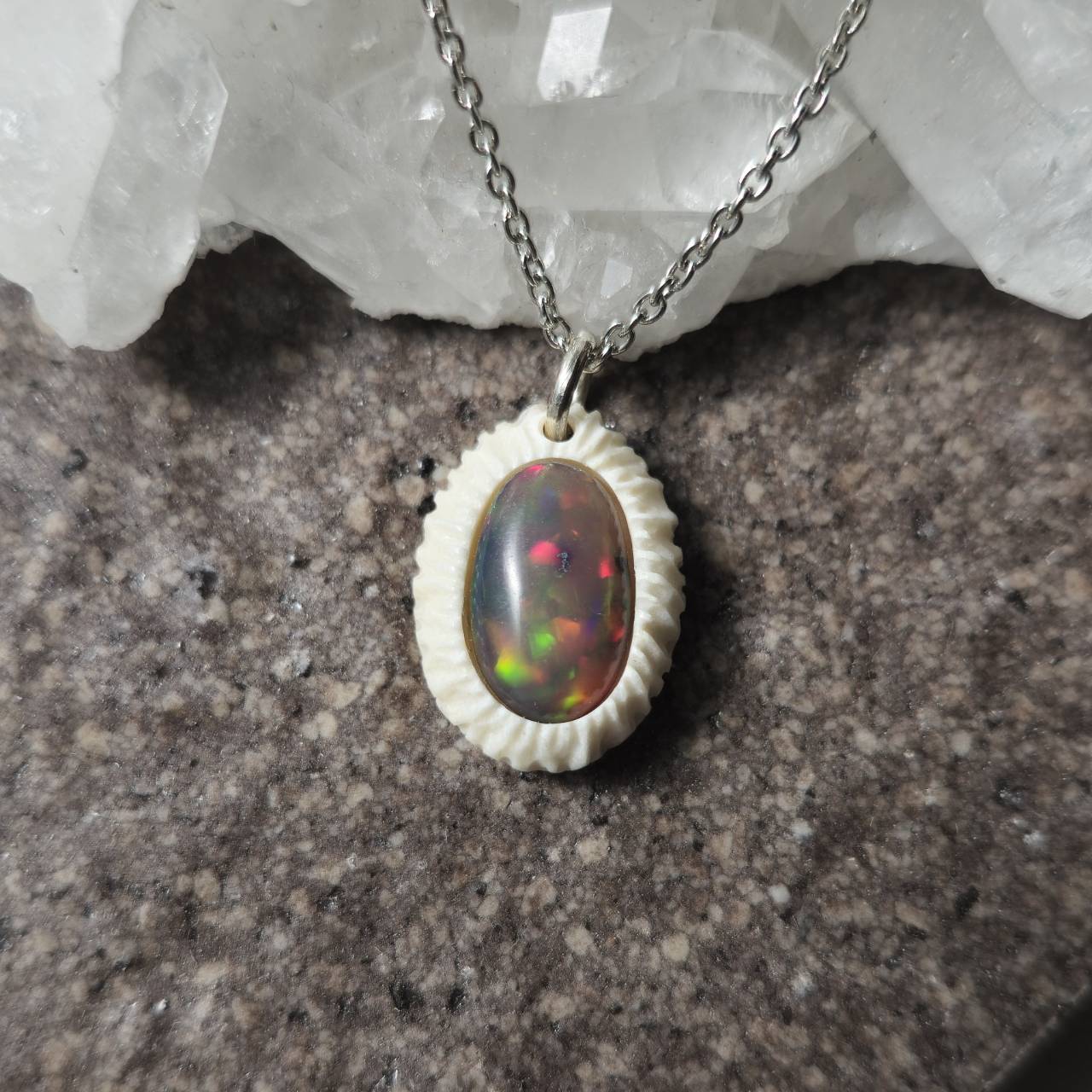 鹿の角の土台にブラックオパールをセットした一点物のネックレスです。