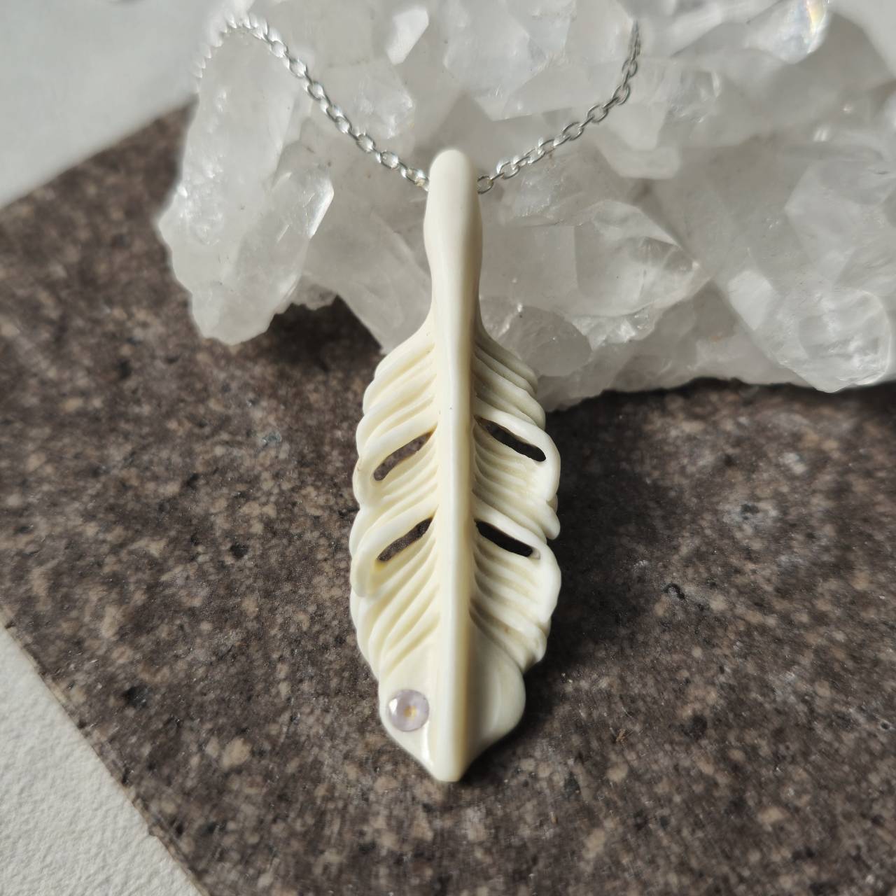 ネイティブアメリカンのフェザーをモチーフに鹿の角で羽を彫りました。