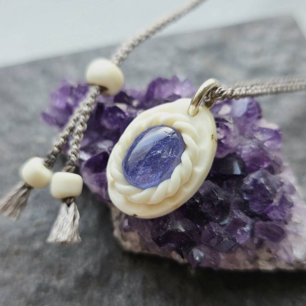鹿の角から削り出した土台にタンザナイトをセットしています。
