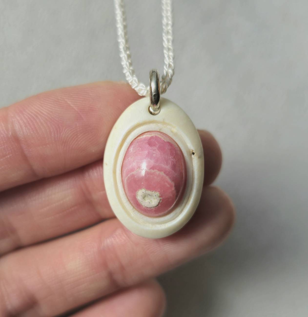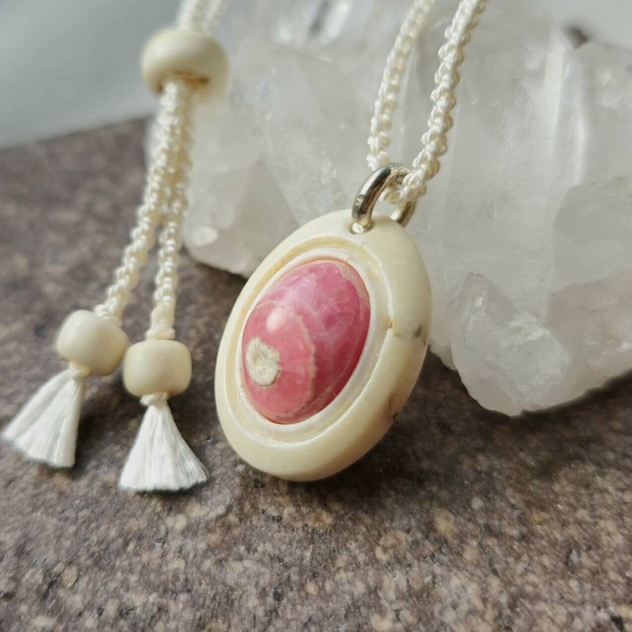鹿の角から削り出した土台にロードクロサイトを埋め込んでいます。
