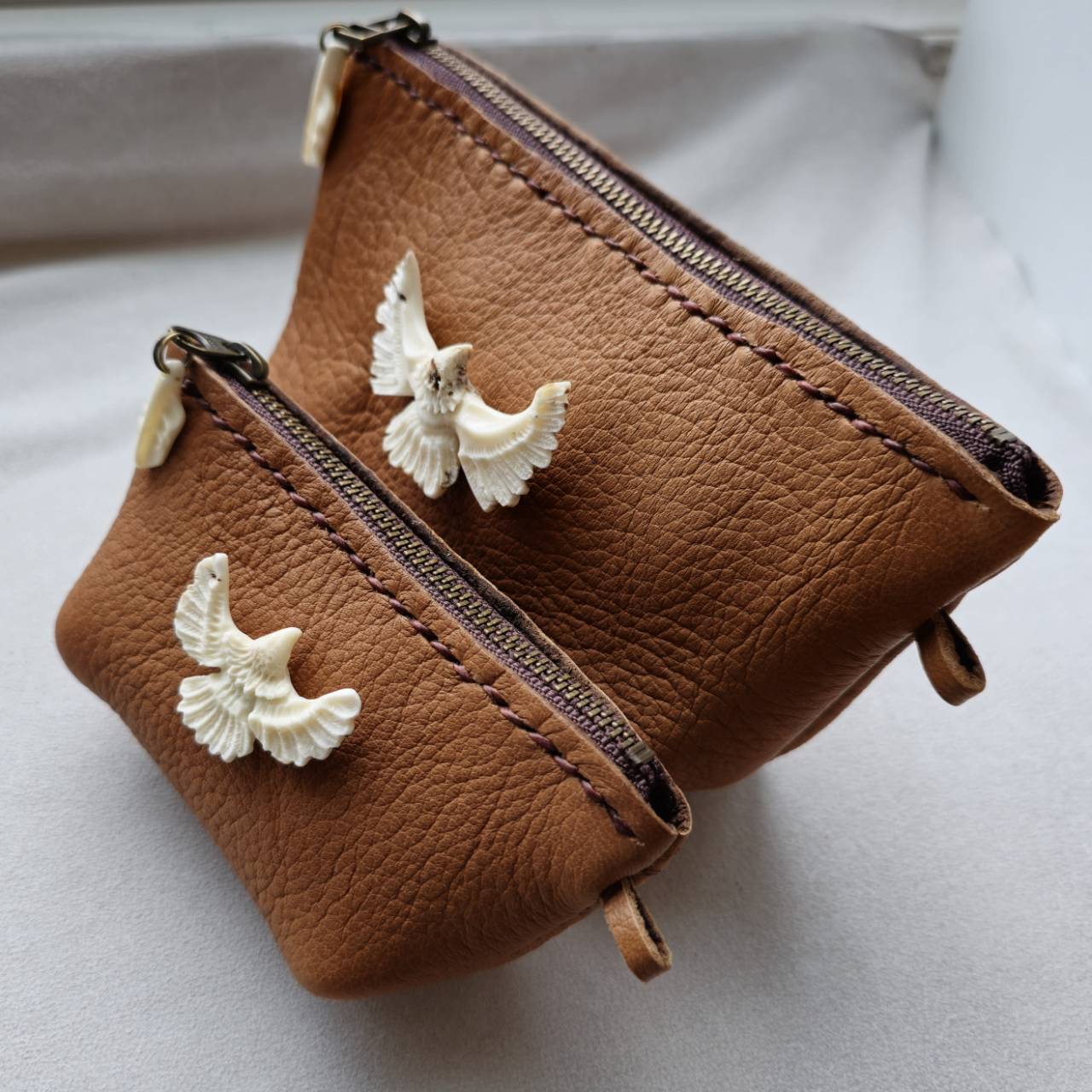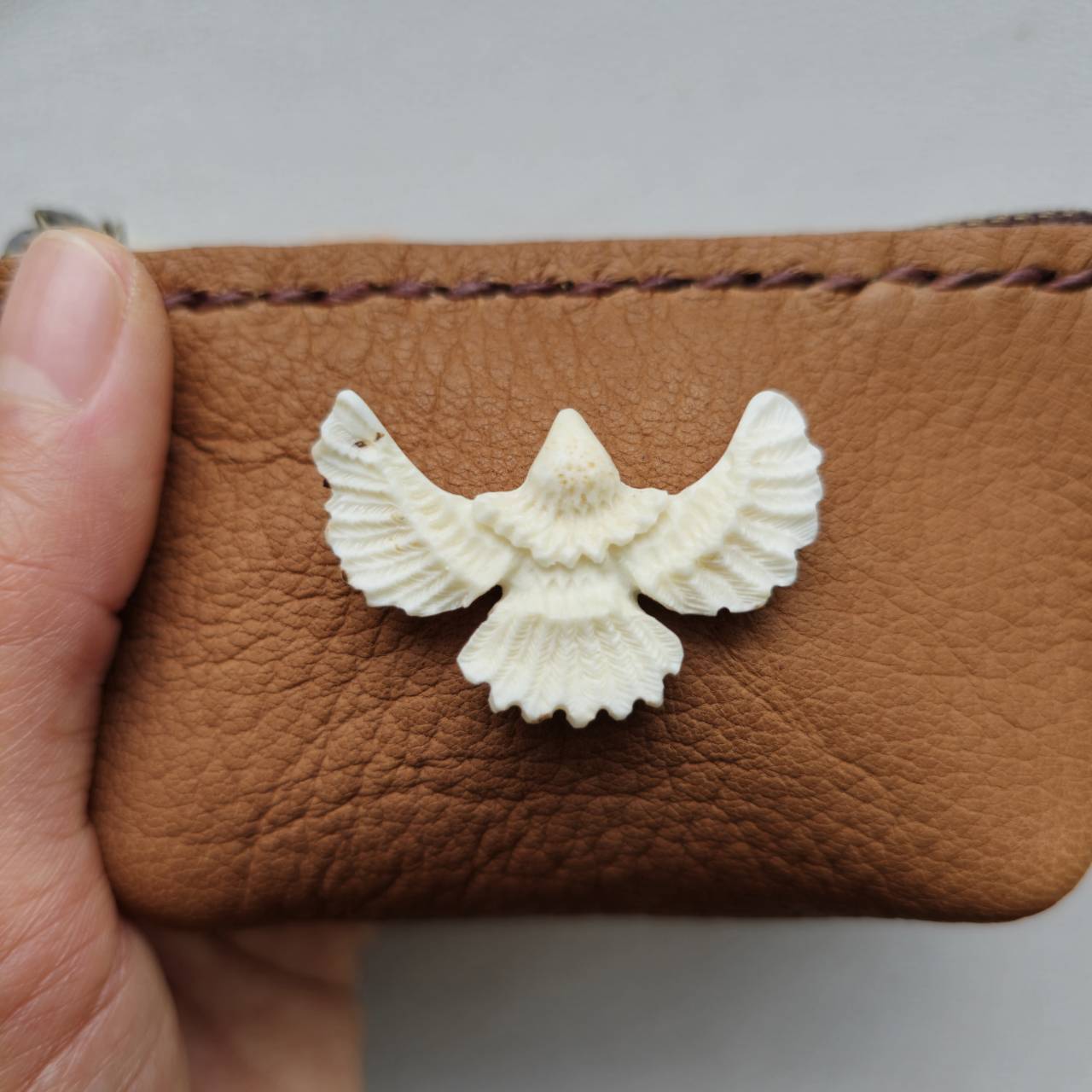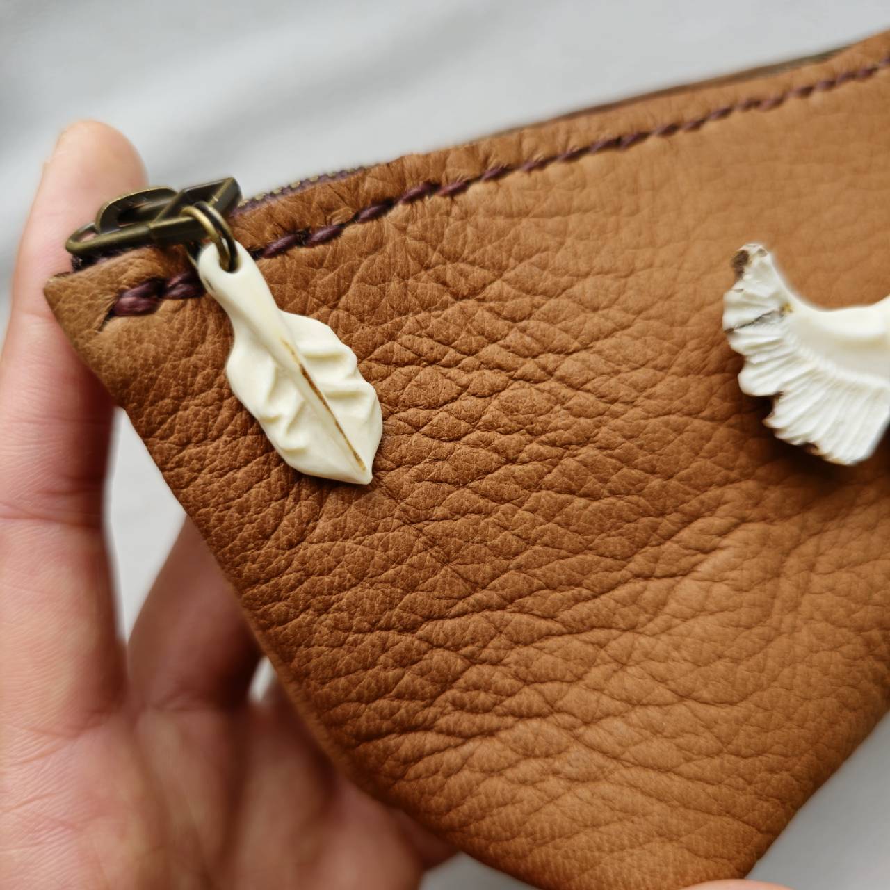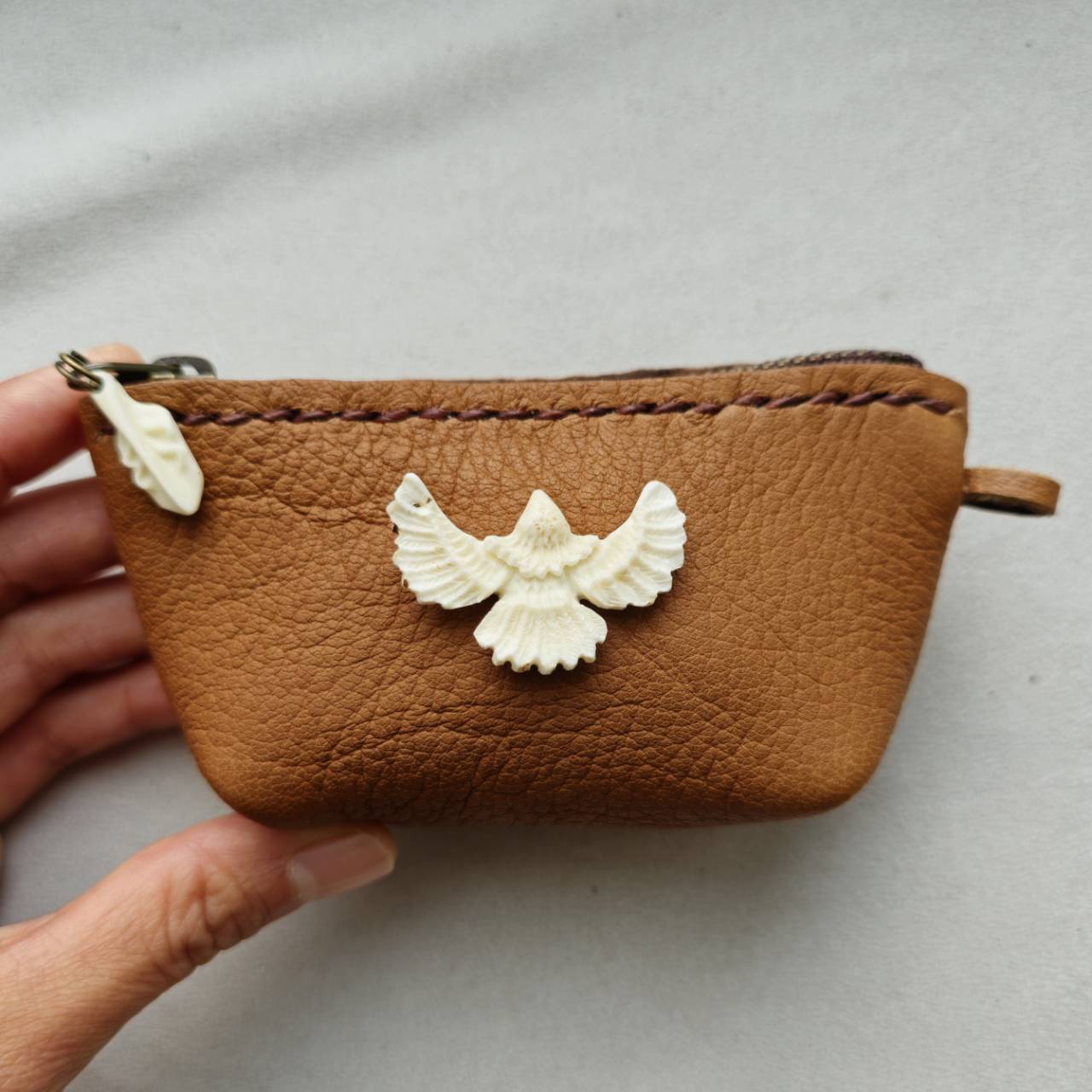開閉のファスナーにはミニフェザーを彫り、チャームとして付けました。