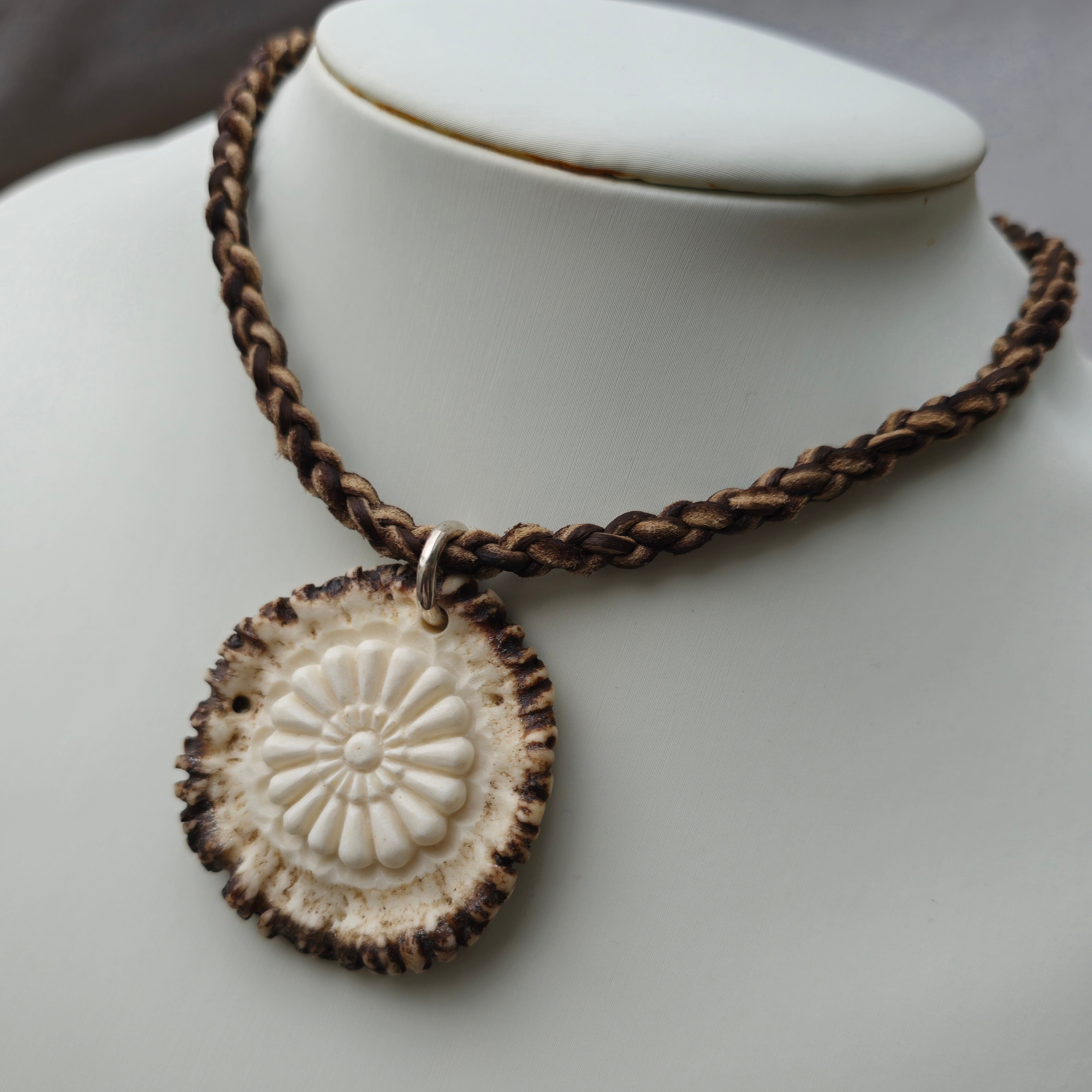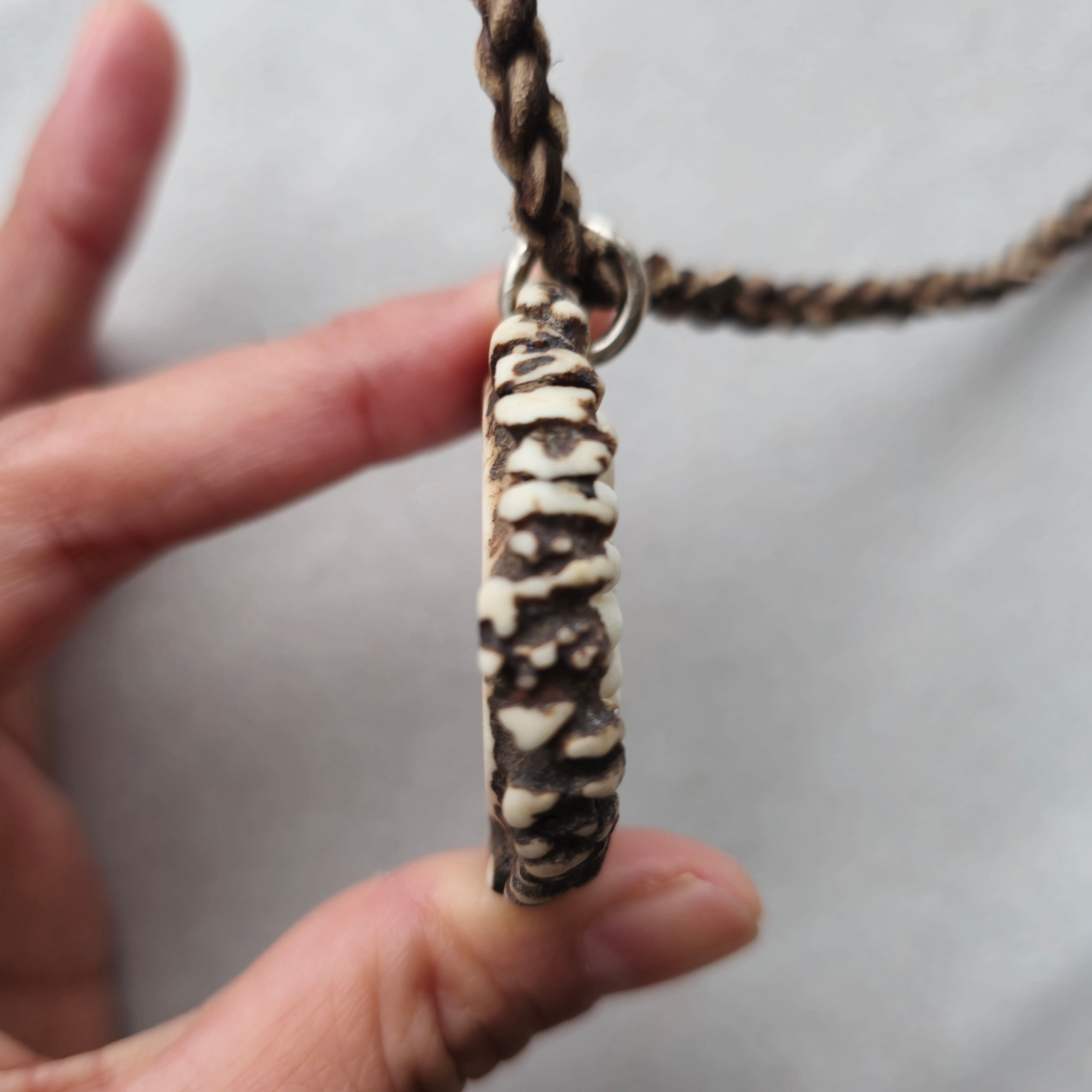 鹿の角の根元を土台に、アイヌの首飾りシトキをイメージして紋様を彫りました。